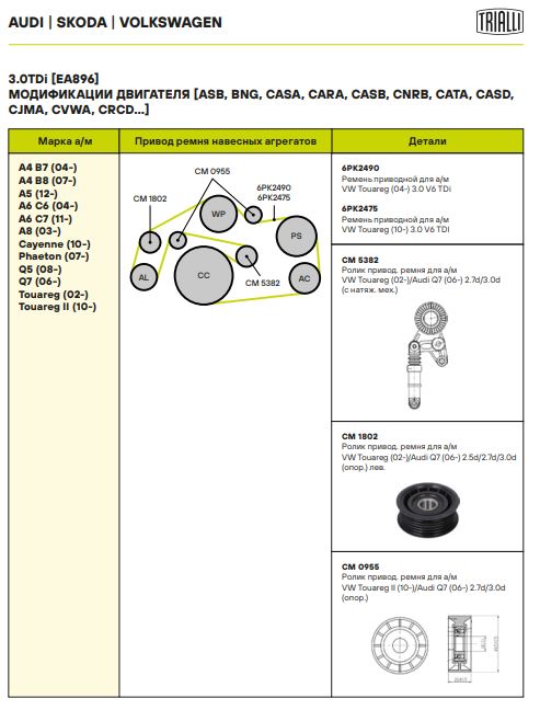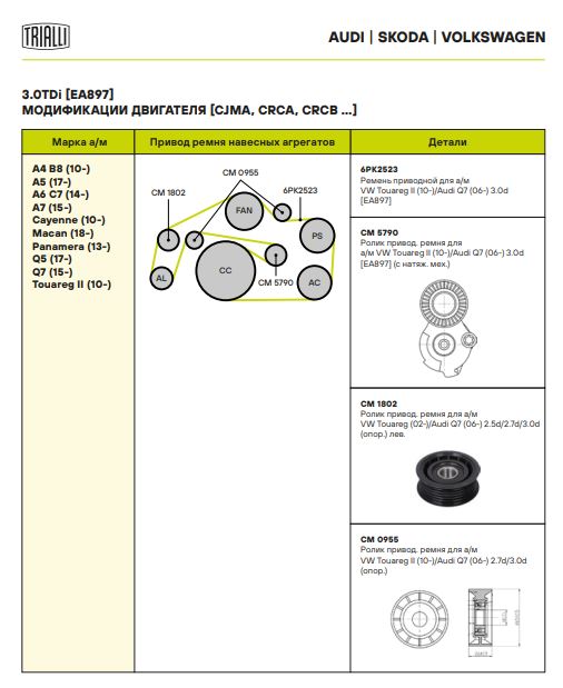| VW | TOUAREG (7P5) | CASD, CJMA, CRCD, CVWA / CASA, CNRB / CJGD, CRCA / CVVA / CATA | 204,240,245,262,225 | 2967 | 2010 - н.в. |
