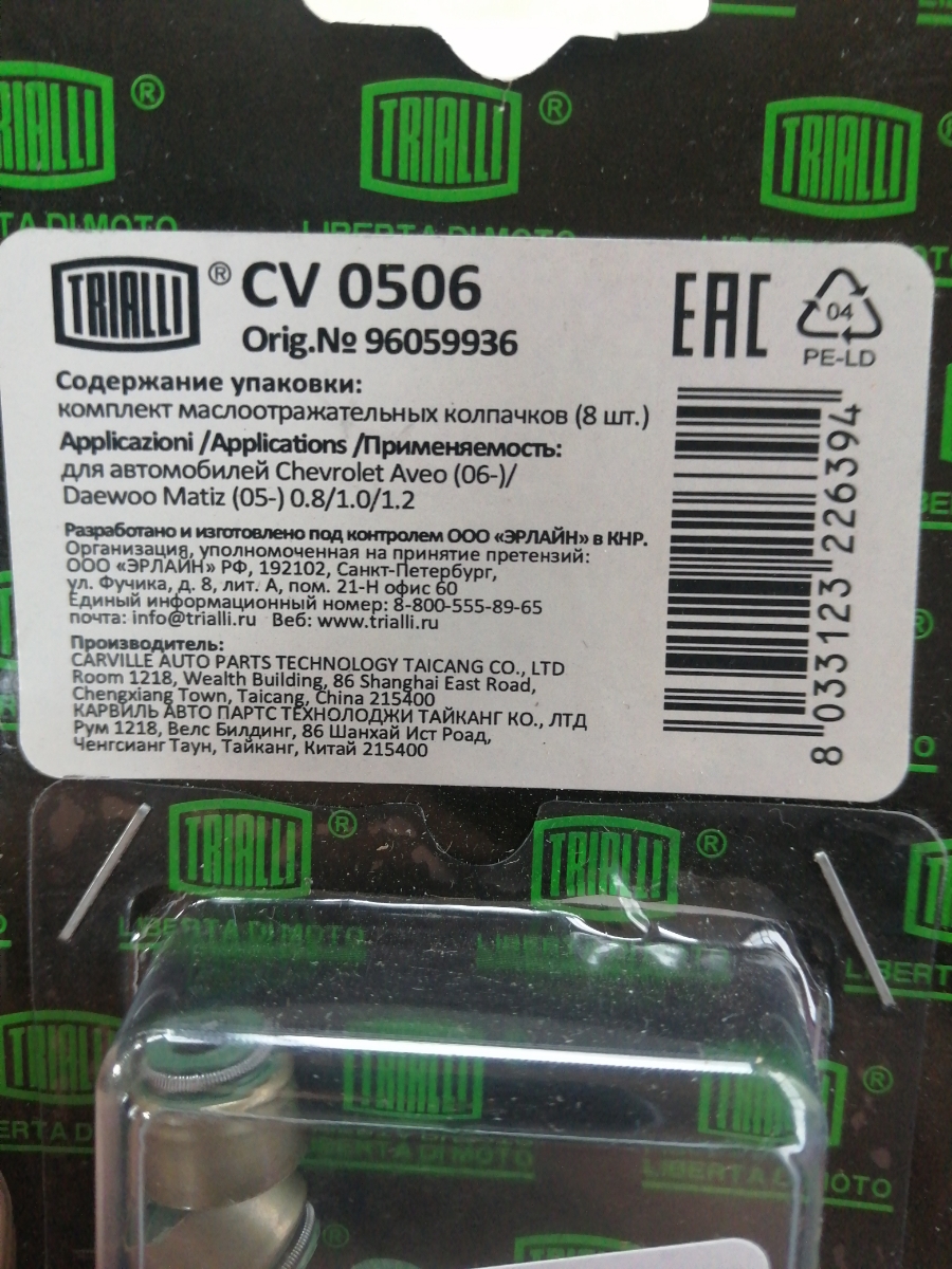 Колпачки маслосъемные для автомобиля Chevrolet Aveo (06-)/Daewoo Matiz (05-)