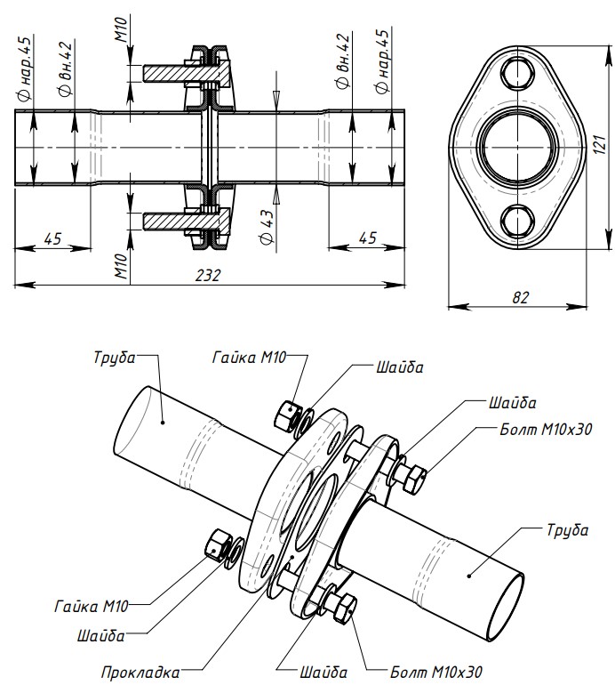 Соединение труб глушителя (комплект фланцев в сборе) FL-45 L=232мм (алюминизированная сталь)