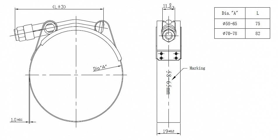 Хомут глушителя силовой T-Bolt D=58-65 мм (нержавеющая сталь)