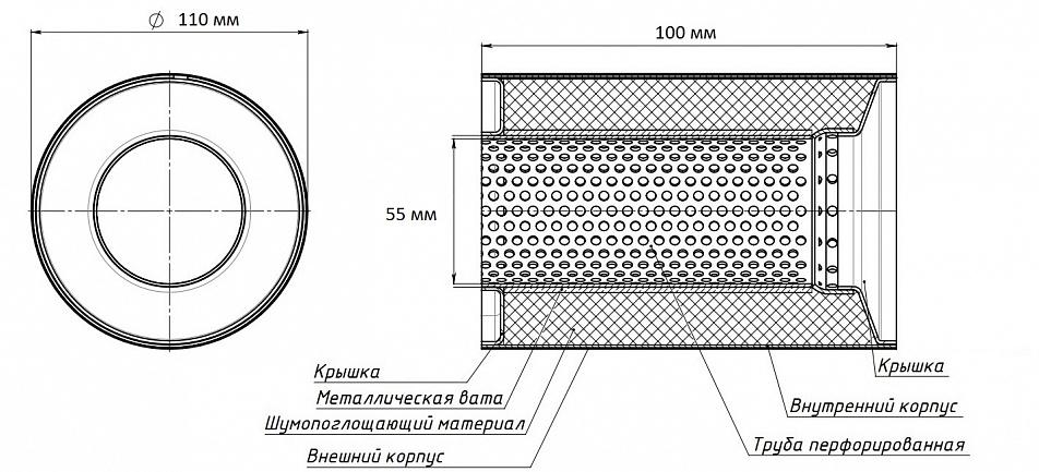 | Особенности конструкции: | Труба перфорированная, шерсть нержавеющая, набивка жаро-шумопоглощающая |