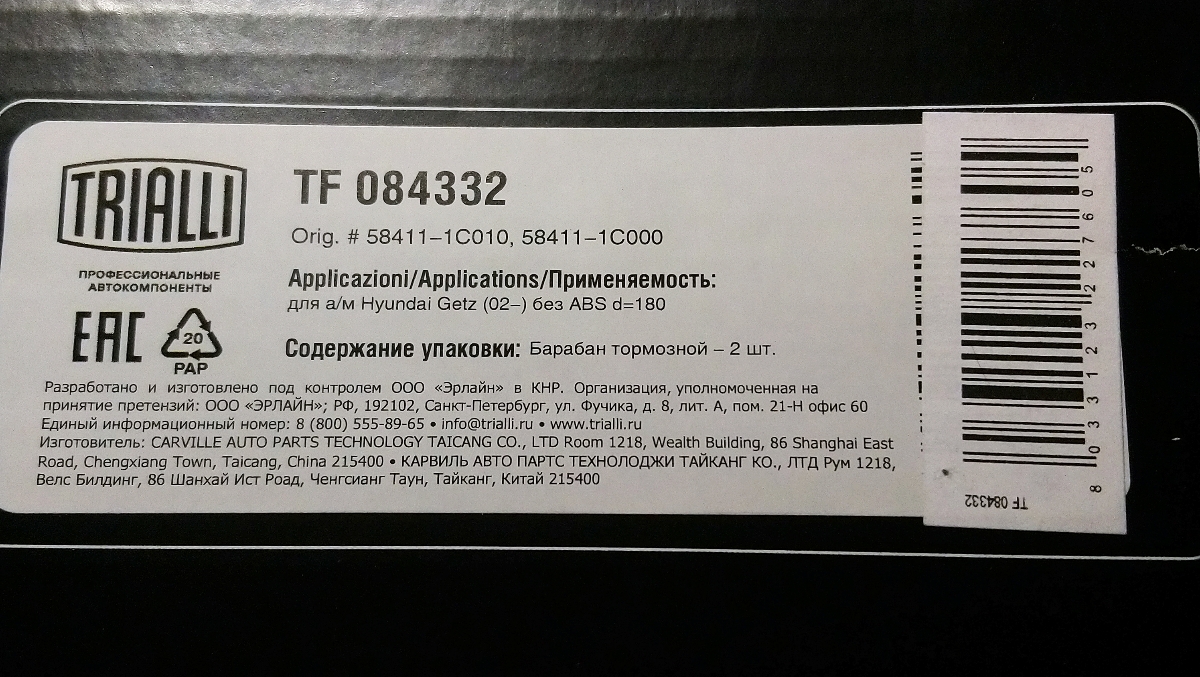 | Максимальный размер расточки тормозного барабана, мм: | 182 |