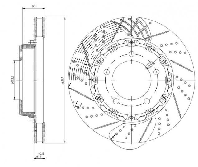 Диск тормозной (ротор) для 6-ти порш. суппорта CRC 6105/CRC 6113 передний левый d=363 PRO [RACE] (перфорированный / слотированный / окрашенный)