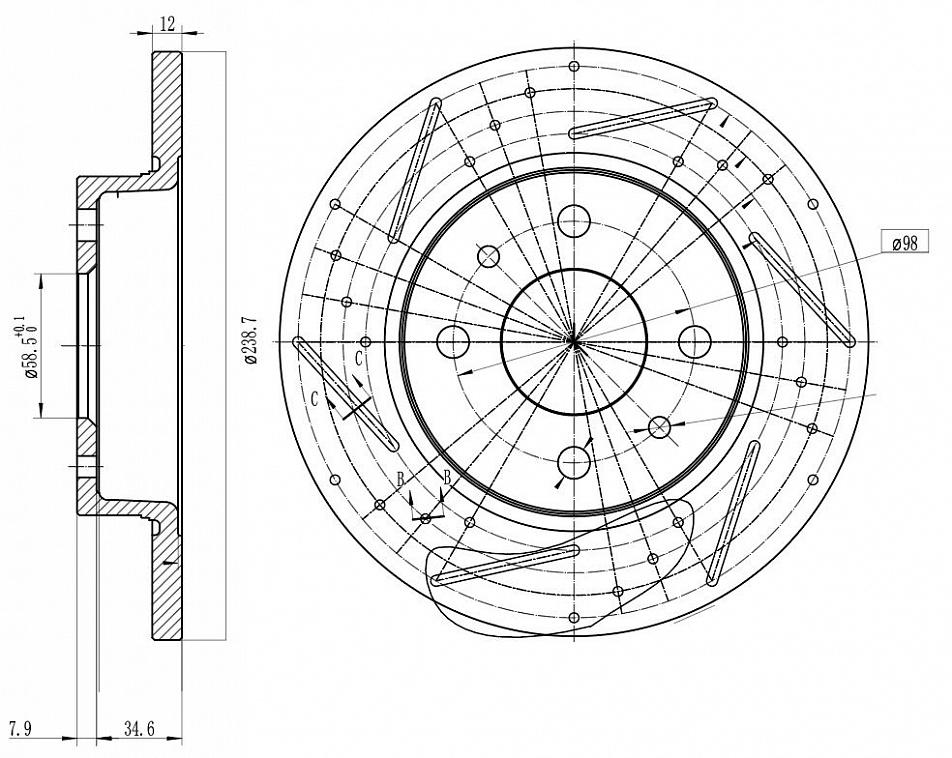 Диск тормозной для автомобилей Лада 2108 передний d=239 PRO (перфорированный / слотированный / окрашенный)